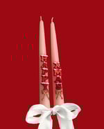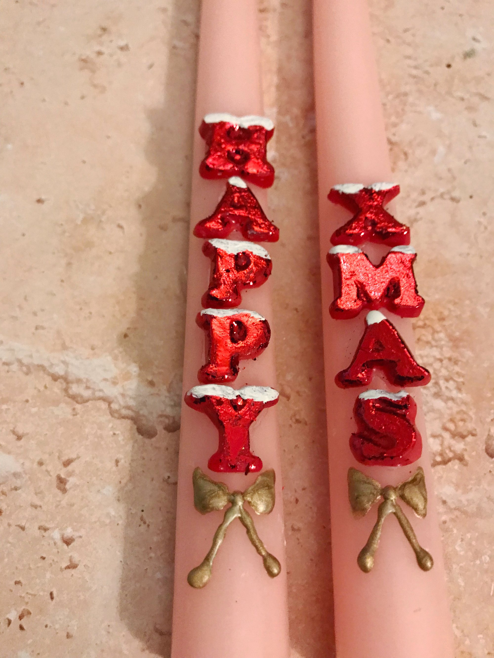 We love the classic pink and red combo, perfect for the Christmas table and mantles all year round. Red gilded leaf adorn the letters, hand finished with a golden wax bow.